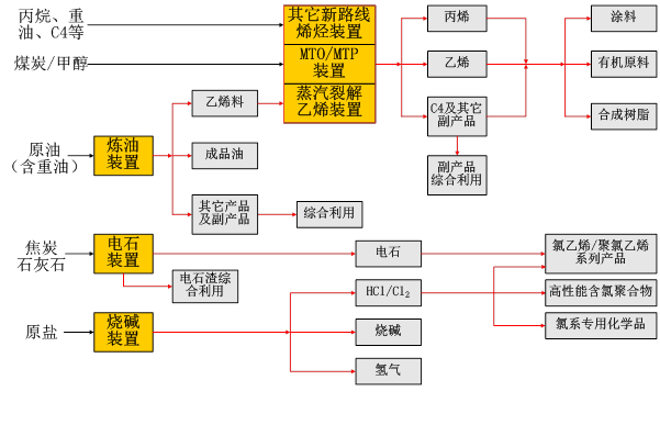氯堿化工:基礎氯堿(燒堿、PVC及糊樹脂等)、氯資源高附加值利用(高性能含氯聚合物、氯系專用化學品)等;