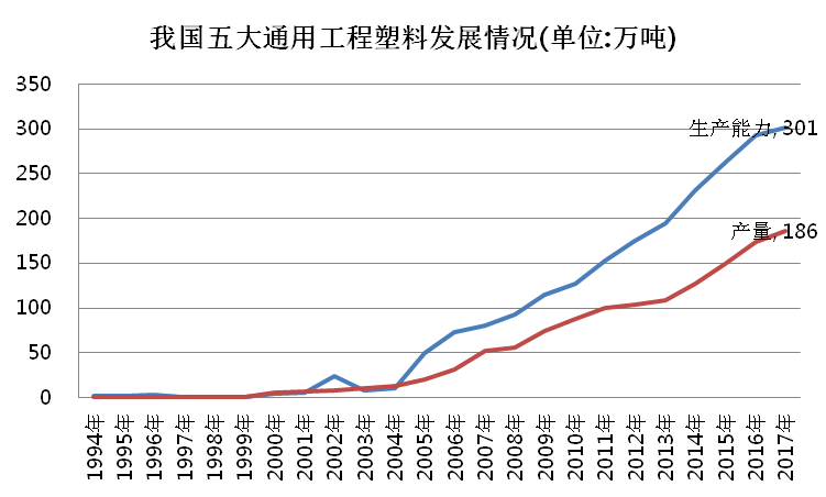 進入九十年代以來,我國工程塑料領域還有一個顯著特征就是,世界著名的公司如GE、杜邦、BASF、拜耳、LG等先后在我國建立了獨資或合資工廠,產量逐年提高,加快了我國工程塑料工業發展。