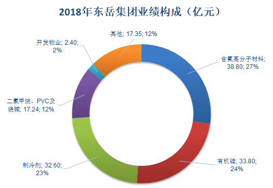 制冷劑、含氟高分子材料和有機硅業務是東岳集團最主要的三大板塊,三大板塊營業收入占總營業收入四分之三。2018年東岳集團靚麗的業績得益于主要板塊業績均實現了大幅度增長:2018年度東岳集團制冷劑營業收入達32.6億元,盈利8.05億元;含氟高分子材料營業收入達38.8億元,盈利9.15億元;有機硅材料營業收入達33.8億元,盈利9.84億元。2018年東岳集團業績構成如下圖所示: