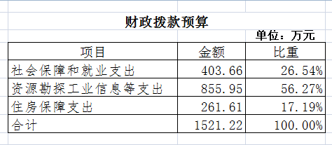 2022年財(cái)政撥款收支總預(yù)算1521.22萬元。收入包括:一般公共預(yù)算財(cái)政撥款1393.30萬元、上年結(jié)轉(zhuǎn)127.92萬元;支出包括:社會(huì)保障和就業(yè)支出403.66萬元、資源勘探工業(yè)信息等支出855.95萬元、住房保障支出261.61萬元。