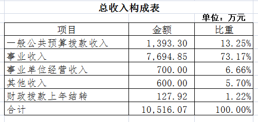 2022年收入預(yù)算10516.07萬元,其中上年結(jié)轉(zhuǎn)127.92萬元,占1.22%;一般公共預(yù)算撥款收入1393.30萬元,占13.25%;事業(yè)收入7694.85萬元,占73.17%;事業(yè)單位經(jīng)營(yíng)收入700萬元,占6.66%;其他收入600萬元,占5.70%。