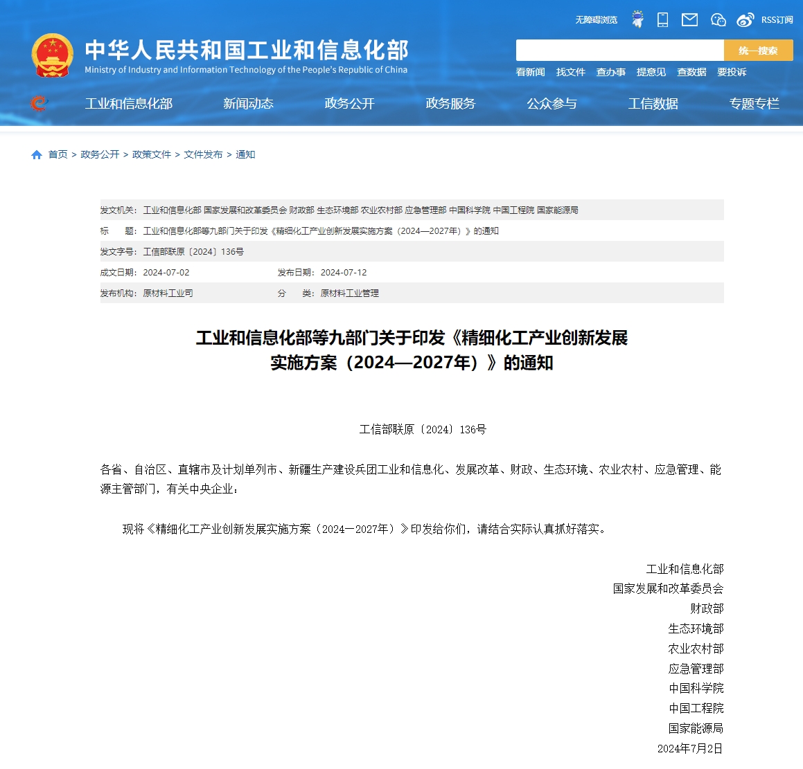 為貫徹國家有關規劃重點任務,引導精細化工產業高端化、綠色化、智能化發展,近日,工業和信息化部、國家發展改革委、財政部、生態環境部、農業農村部、應急管理部、中國科學院、中國工程院、國家能源局等9部門聯合發布《精細化工產業創新發展實施方案(2024—2027年)》(以下簡稱《實施方案》)。