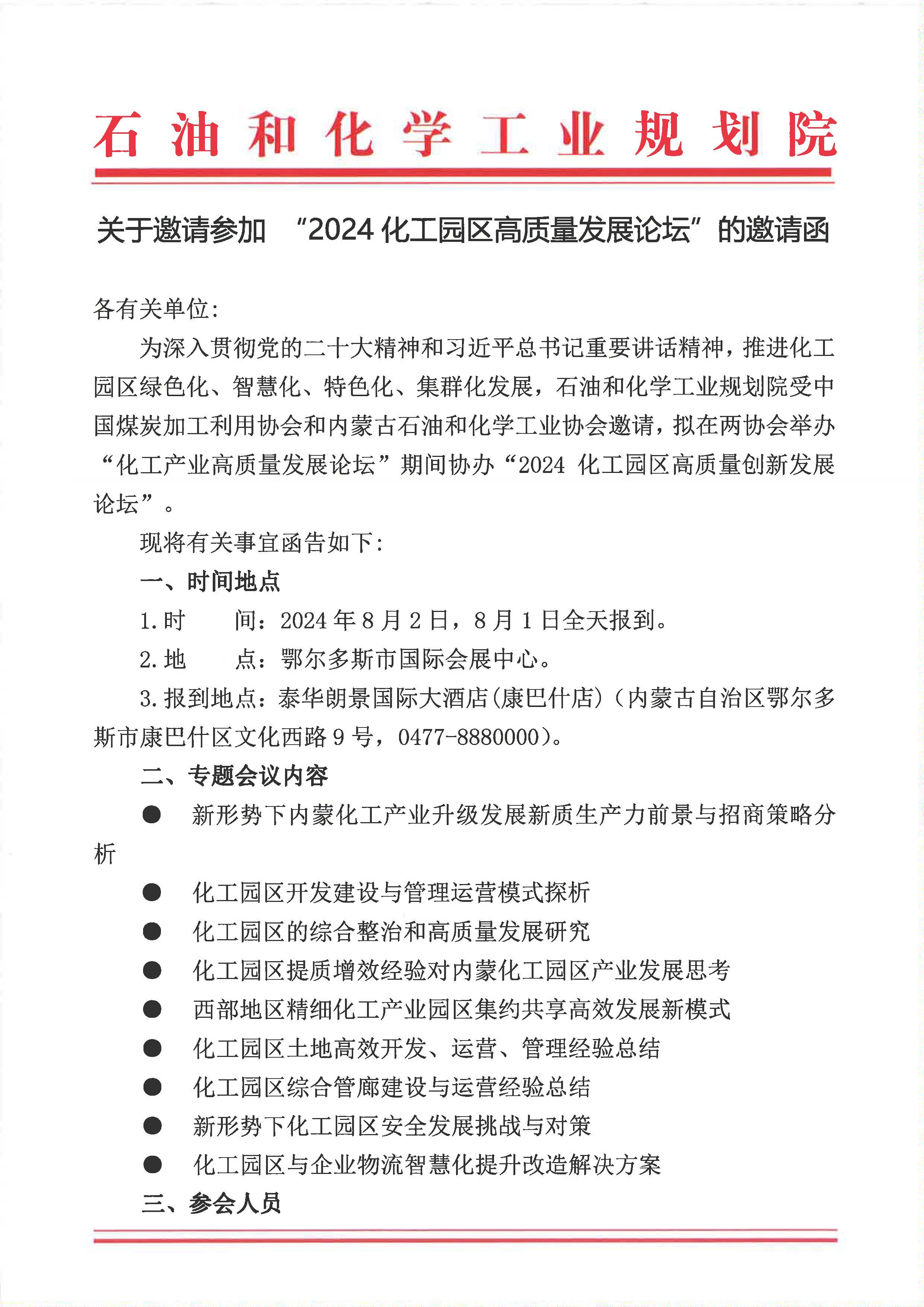 為深入貫徹黨的二十大精神和習近平總書記重要講話精神,推進化工園區綠色化、智慧化、特色化、集群化發展,石油和化學工業規劃院受中國煤炭加工利用協會、內蒙古石油和化學工業協會邀請,擬在兩協會舉辦的“化工產業高質量發展論壇”期間協辦“2024化工園區高質量創新發展論壇”。