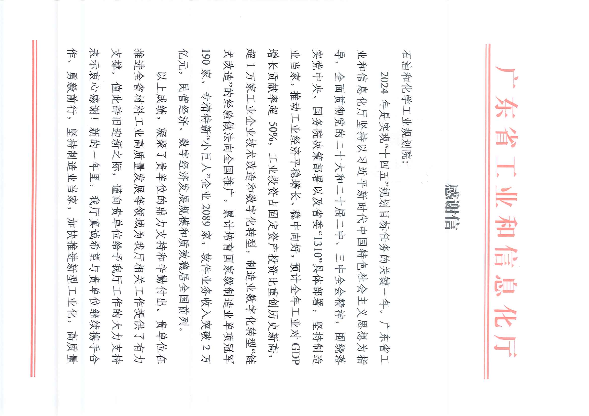 2024年,石油和化學工業規劃院積極發揮行業智庫的作用,支撐廣東省工業和信息化廳在綠色石化產業高質量發展、化工新材料產業創新發展、中試基地建設等方面開展了一系列工作,獲得了廣東省工業和信息化廳的高度認可。