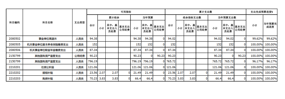 如上圖所示,我單位2024年度預算執行進度為97.85%,情況良好。除“離退休費(完成率99.62%)”和“其他國有資產監管支出-人員類(完成率96.17%)”兩個項目,因年末新增追加投資已無法按時支付外,原預算計劃完成率為100%。