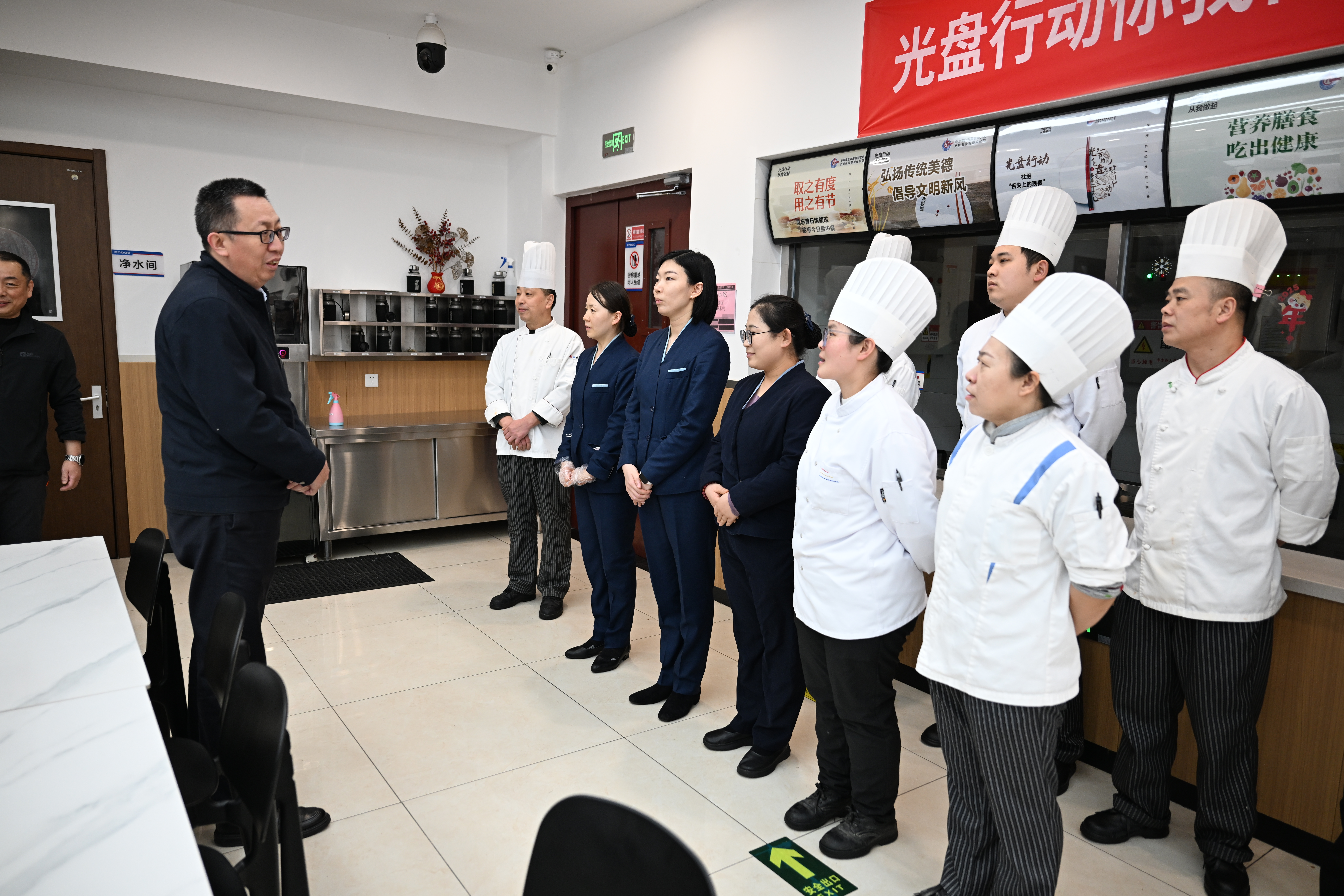 在職工食堂,王鈺副院長(左一)看望廚師與服務員